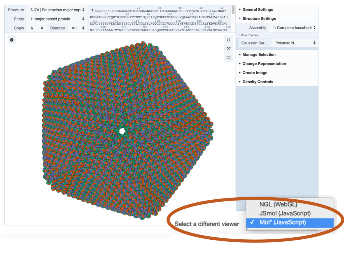 View for Faustovirus (PDB 5j7v) at RCSB.org. Toggle between 3D viewers at the bottom of the display.