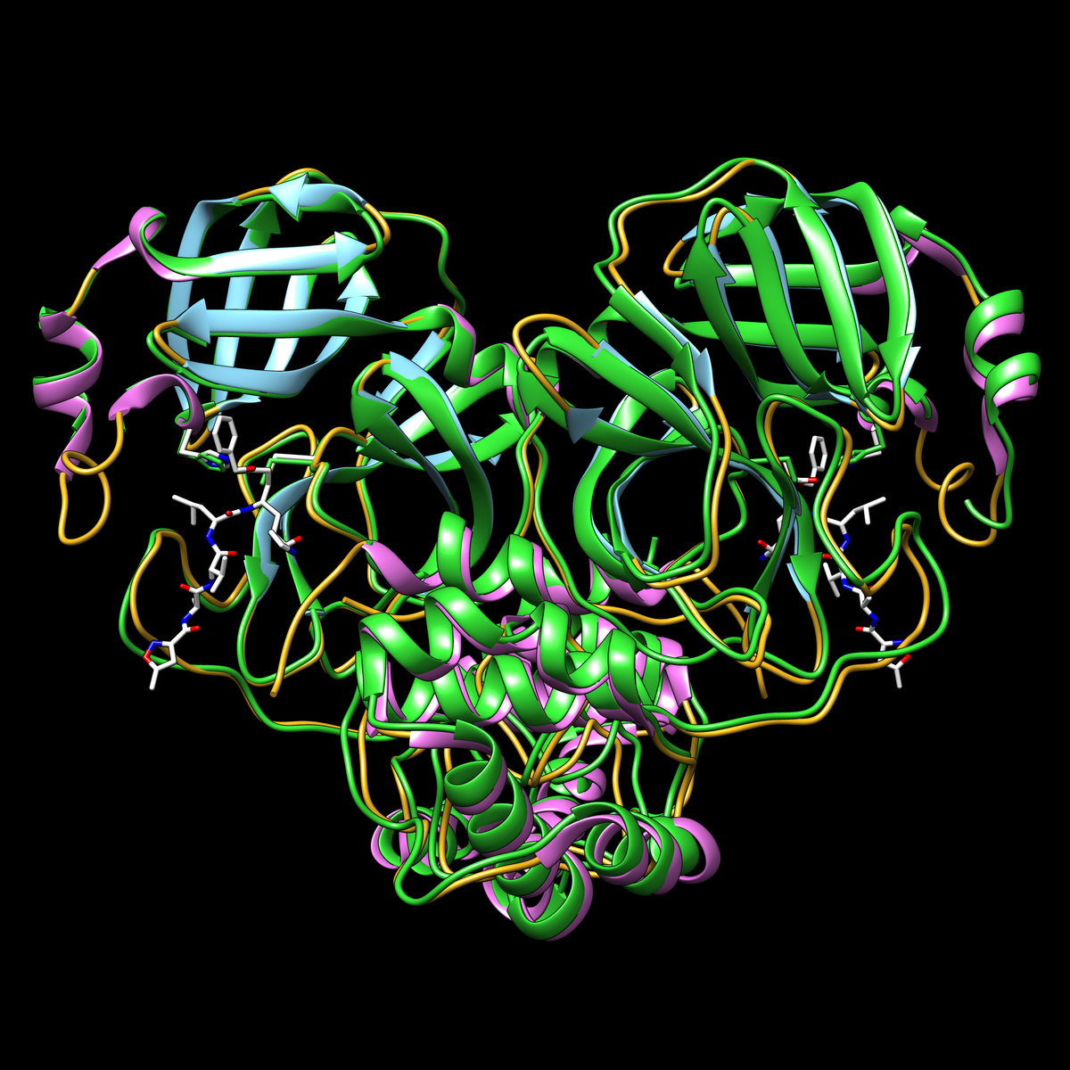Structural similarity of the SARS-CoV-2 main protease (PDB structure 6lu7) and the SARS coronavirus main protease (PDB structure 1q2w in green)Video