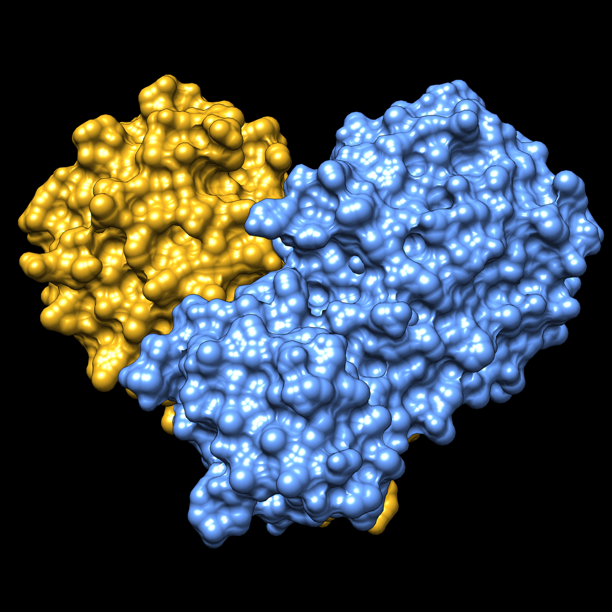 Shown in a surface representation, with the two halves of the dimer in yellow and blue.