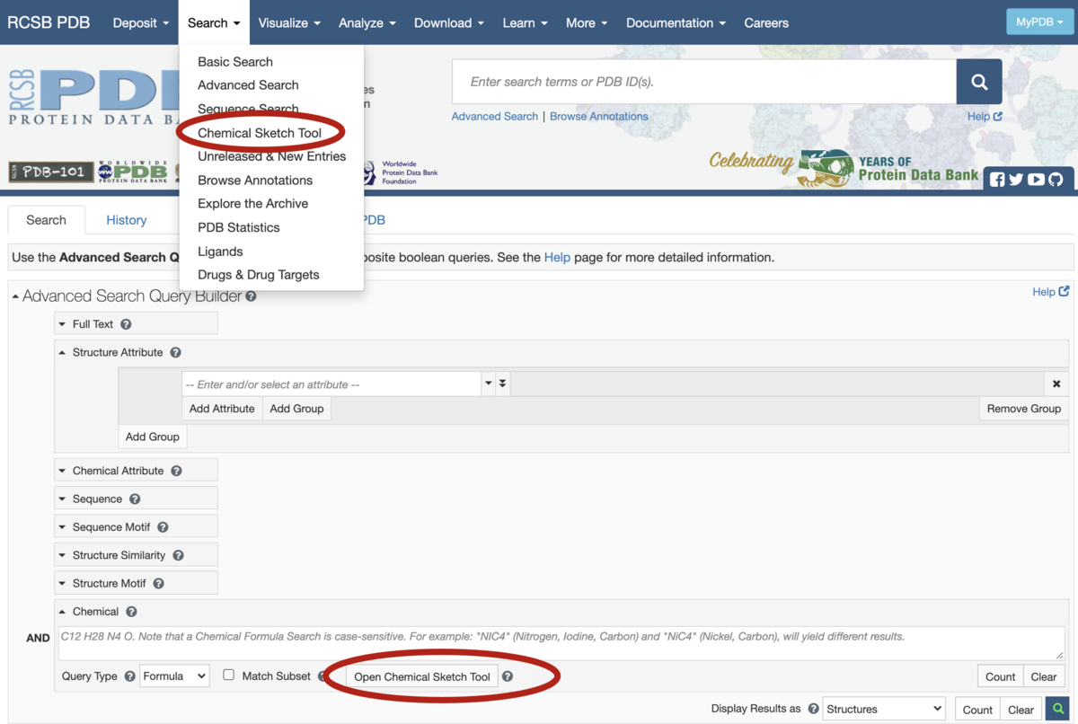 Use the Chemical Sketch Tool to draw or edit a molecule, then use the resulting SMILES or InChI string to search for matching molecular definitions in the PDB Chemical Component Dictionary.
