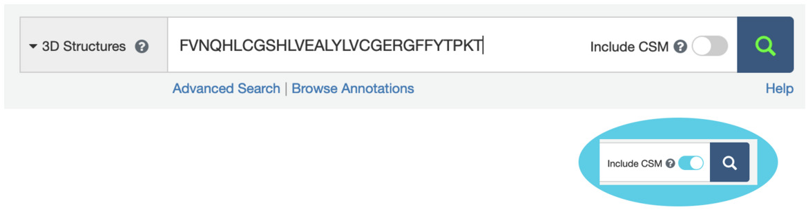 For example, a search for the sequence FVNQHLCGSHLVEALYLVCGERGFFYTPKT will currently return >400 entities for exploration. Including the option for CSMs will add ~100 more examples.