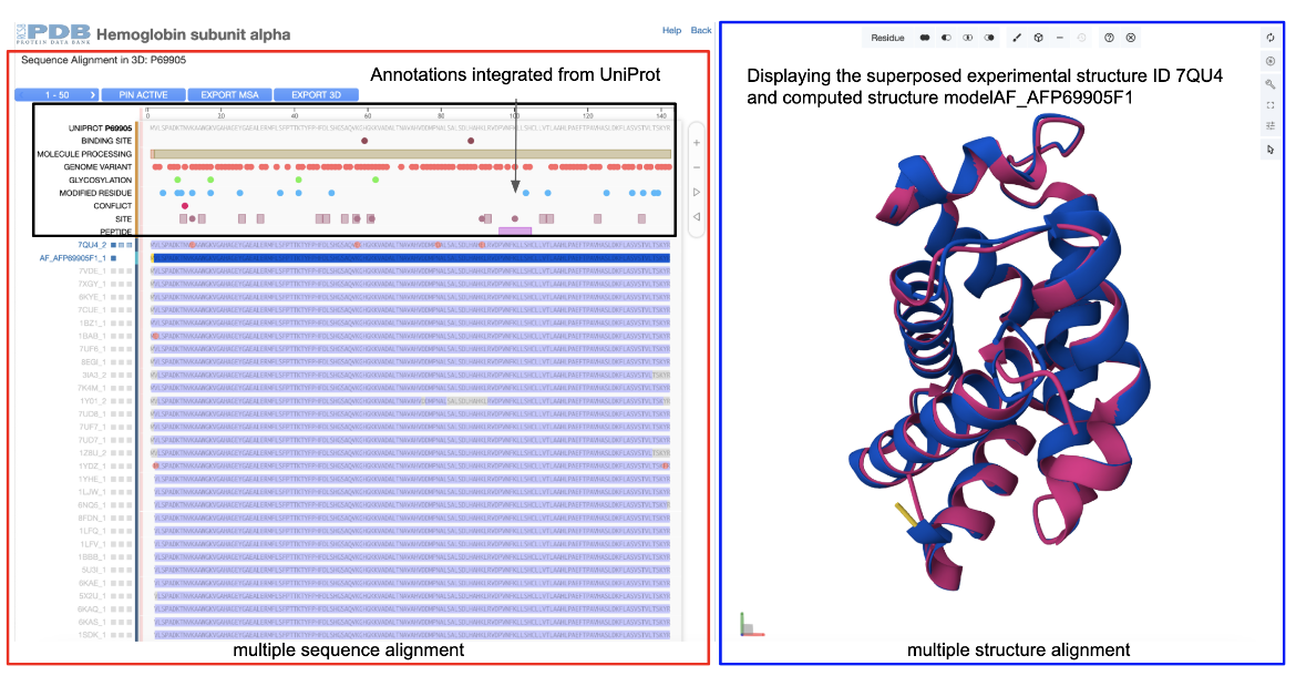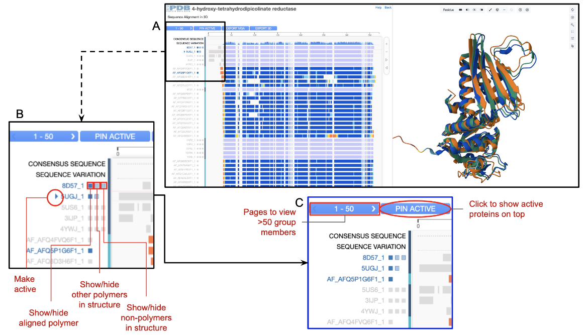 - The sequence annotations displays the multiple sequence alignment on the left hand side of the web page, while 3D structures of protein entities selected to be active from the MSA can be viewed in the panel on the right. An example of a Sequence Alignment in 3D for Sequence Identity group is shown in Figure 2, while an example of an Alignment for grouping based on UniProt accession is shown in Figure 3.