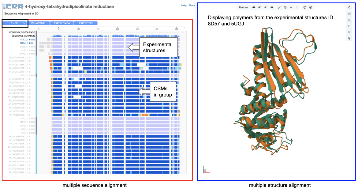 - New proteins can be added to the structure view panel by clicking on the polymer entity listed in the MSA in the sequence alignment panel (red box in Figure 2). The structure of the selected entity is aligned with the currently visible displayed structures and the superposition is displayed.