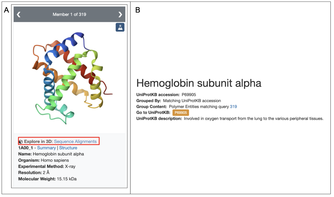 The tool or app is available for Sequence Identity Groups or UniProt based Groups from Group Summary Pages Carousel (Explore in 3D: Sequence Alignments link, Figure 1A). The number of members in the group is listed as the Group Content. Clicking on the hyperlinked number listed will launch a search for all members of the group (Figure 1B).