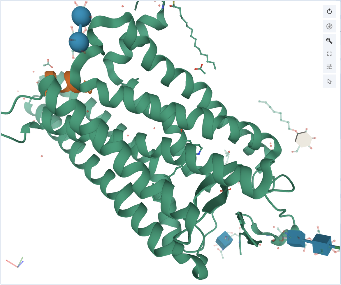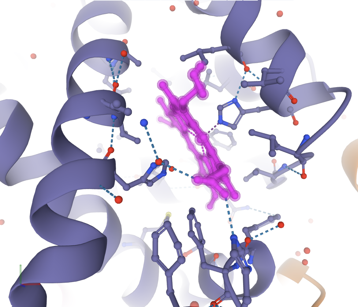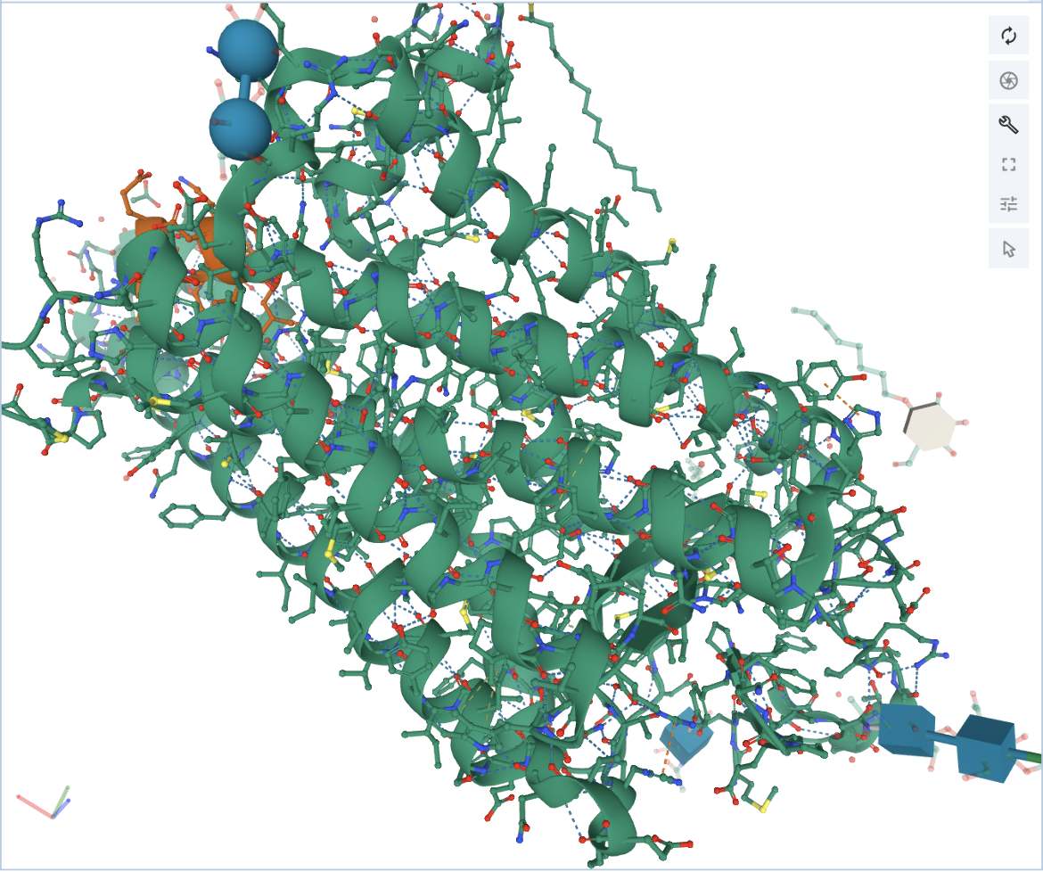 9. Turn on the polymer chains, water, and ligands using the components panel eye-icon to see the binding pocket in the context of the overall structure.