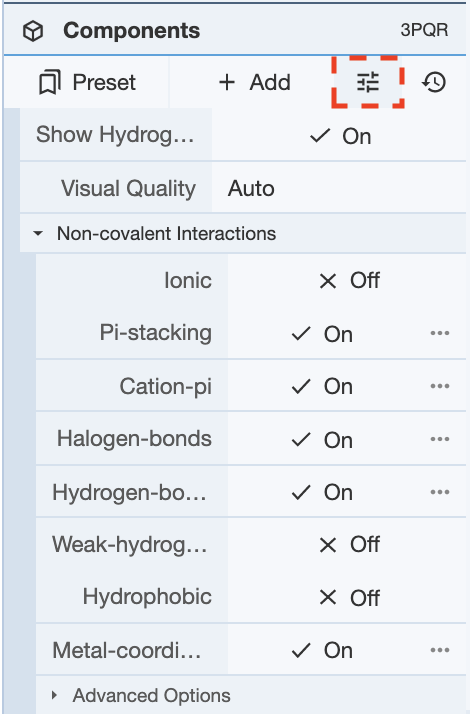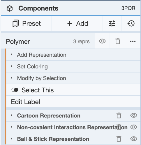 In order to show any non-covalent interactions, the components’ representations need to be adjusted. Non-covalent interactions is one of the representations available if you click Add Representation for any of the components. The non-covalent interactions that are shown can be modified using the options under the button next to Add in the Components Panel. Once Non-covalent Interactions is clicked on, a drop-down menu will show the various non-covalent interactions that can be toggled on and off for viewing.