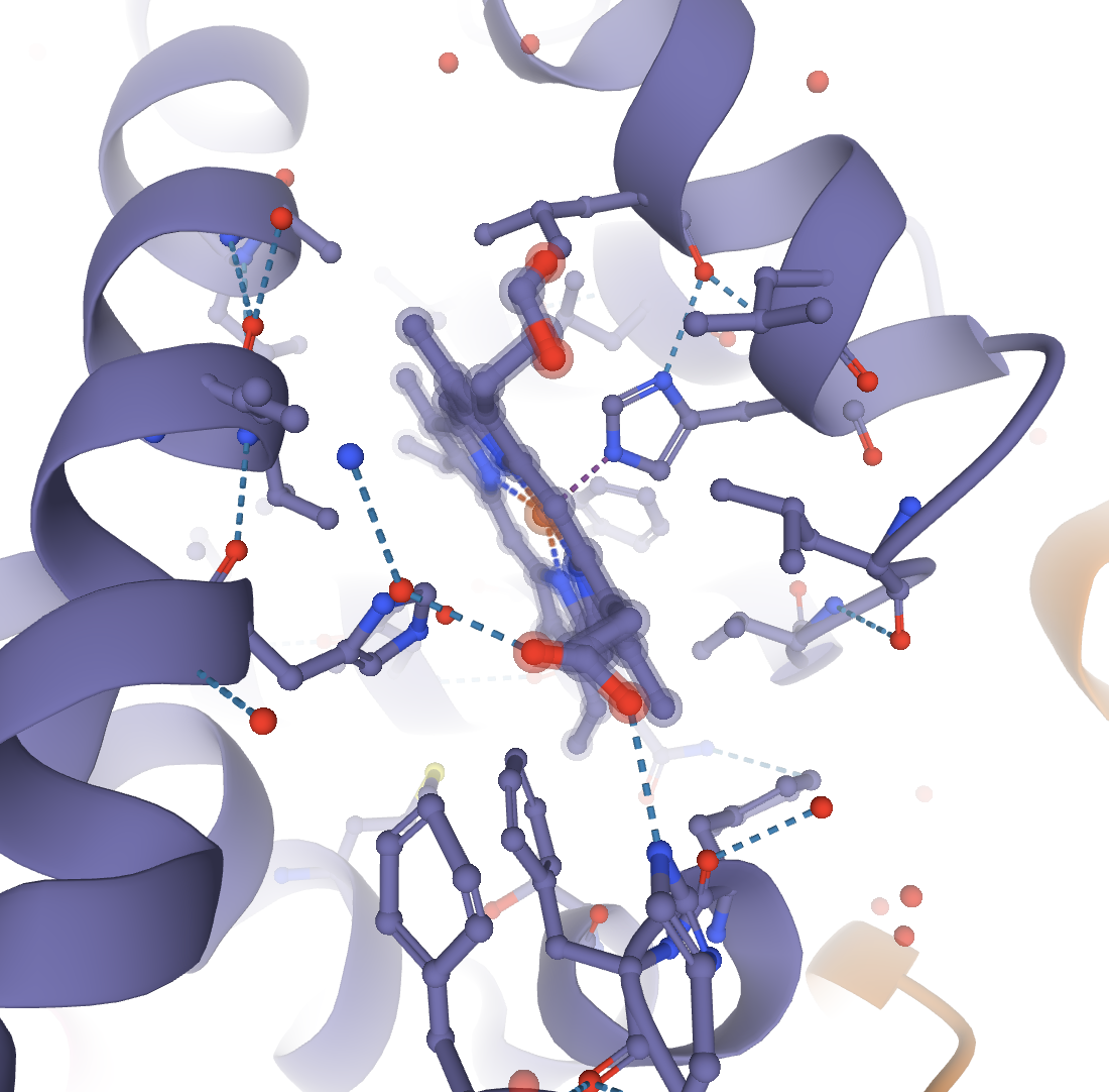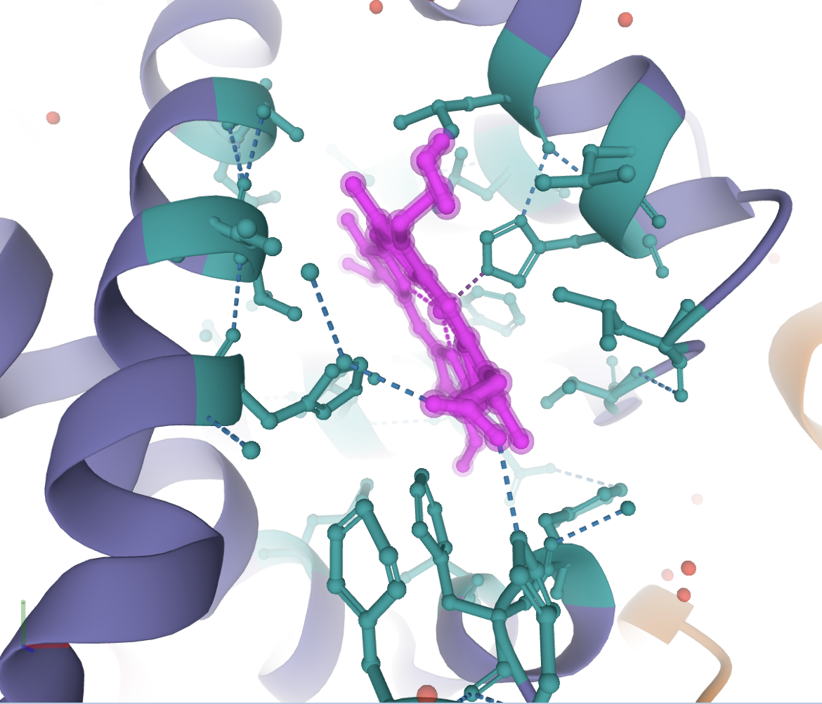 Now the interactions between the heme group and the protein are shown. If you click away from this, the structure will unfocus and go back to the starting display. You will need to focus again. To color the heme group one color and the surrounding residues a separate color, these are the steps that can be taken. In order to first color the heme group, you will need to select it. Click open the Selection Mode toolbar. Select the heme group by clicking on it in the 3D canvas. Now color it the desired color using the color tool in the Selection Mode toolbar, and clicking Apply Theme.