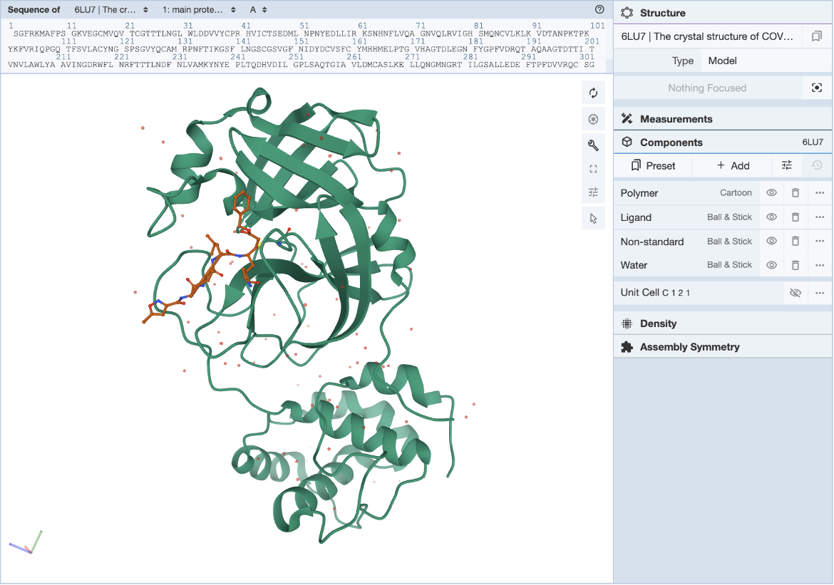 Sometimes, when a structure is loaded, a portion of the structure may have multiple representations, and changing the representation does not fix the problem. In this case, it is helpful to empty out all the preset components and create them again with the representation you desire. In this example, we will use the structure (6LU7) for the SARS-CoV-2 main protease with an inhibitor N3. When you pull up this structure, it shows the whole structure with the inhibitor as well.
