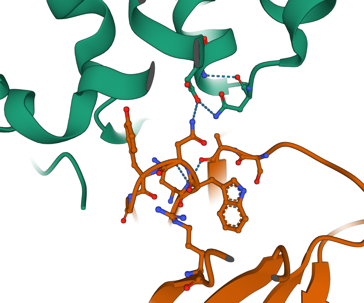 At this point, click on Polymer, and click Add Representation. To be able to visualize the atoms that are involved in the non-covalent interactions, turn on both the Ball & Stick and Non-covalent Interactions. Now there should be three representations, and the structure should look like this.