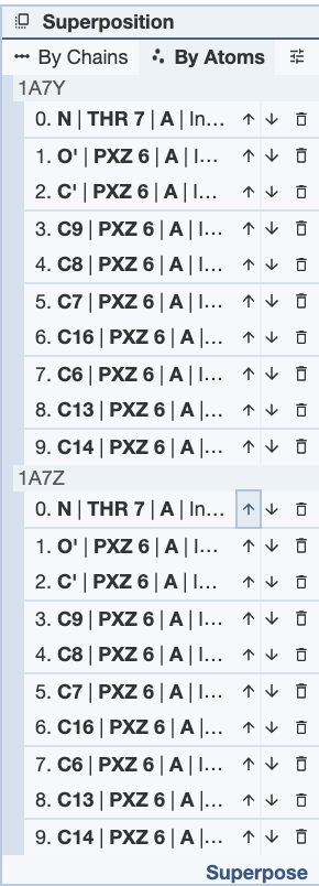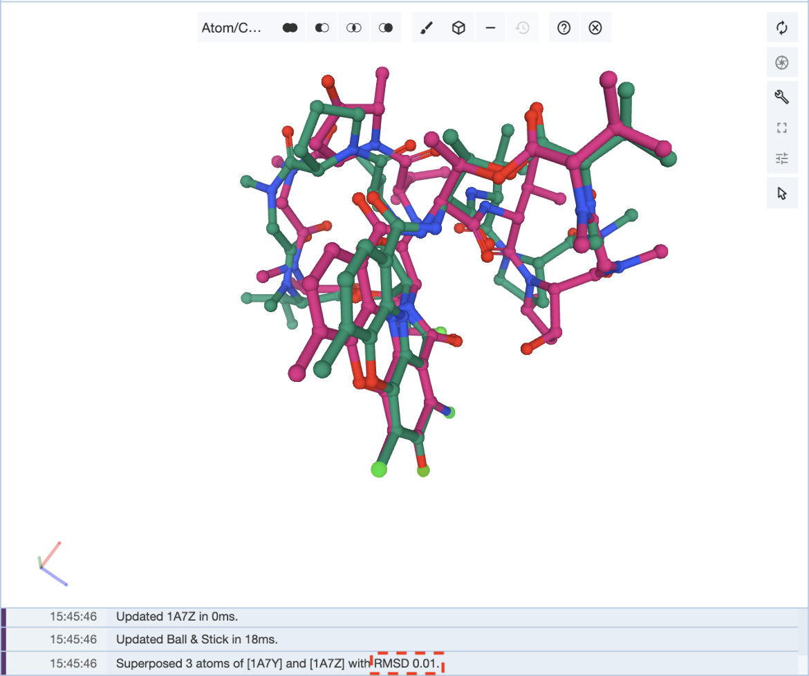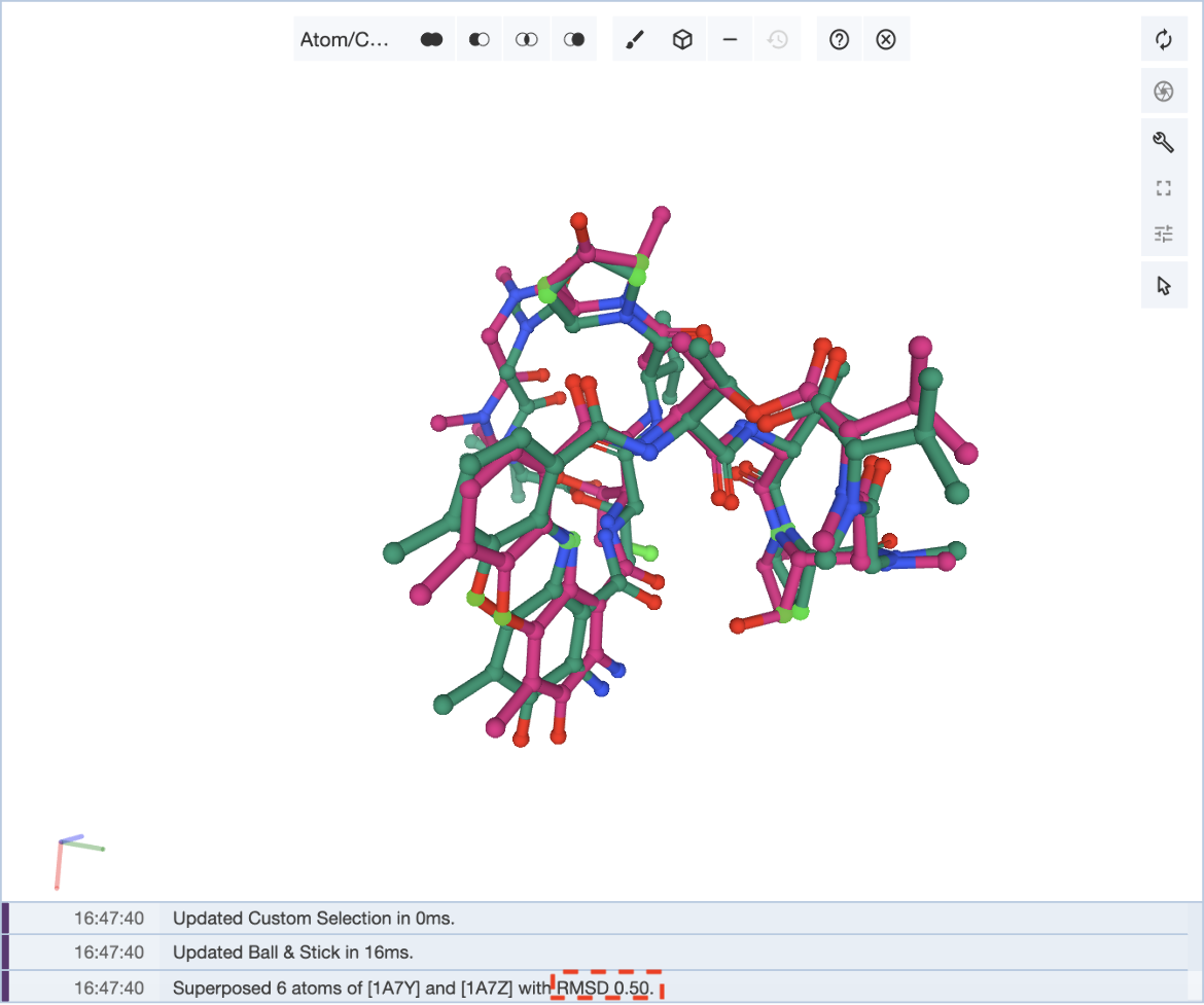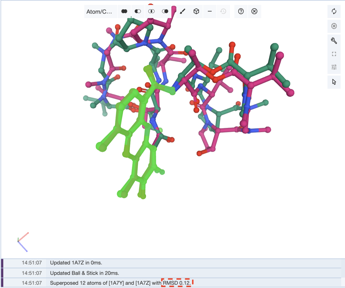 Superposing by atoms is helpful when looking at the orientations of a small molecule present in multiple structures.This is an example of where superposing structures by atoms is helpful: the antibiotic structures for actinomycin 1A7Y and 1A7Z. In this structure, the core atoms that remain the same were selected in the same order, and this superposition gives an RMSD value of 0.12.