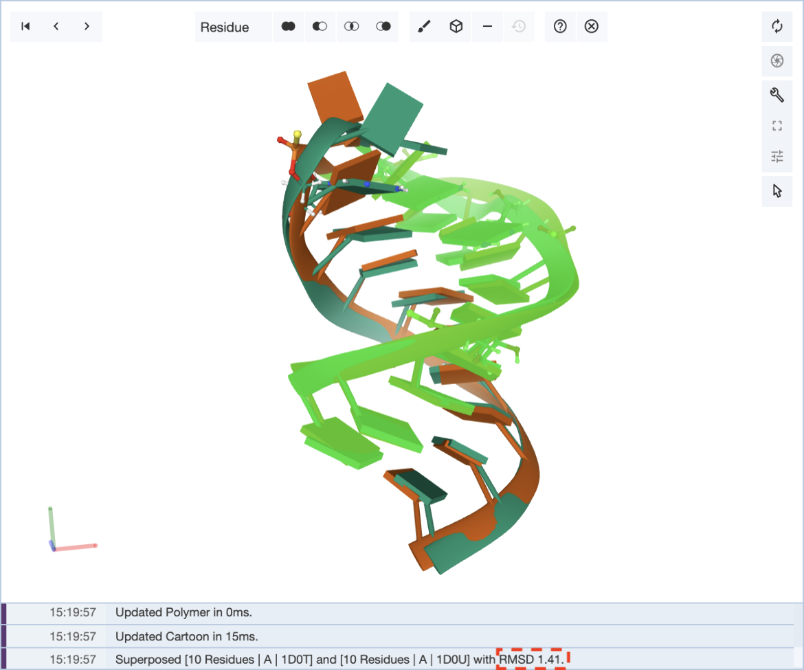 The level of similarity between the selections in the two structures can be assessed by examining the superposed structures visually in the 3D canvas and also by monitoring the root-mean-square deviation (RMSD) displayed at the bottom of the page in the Log Panel.