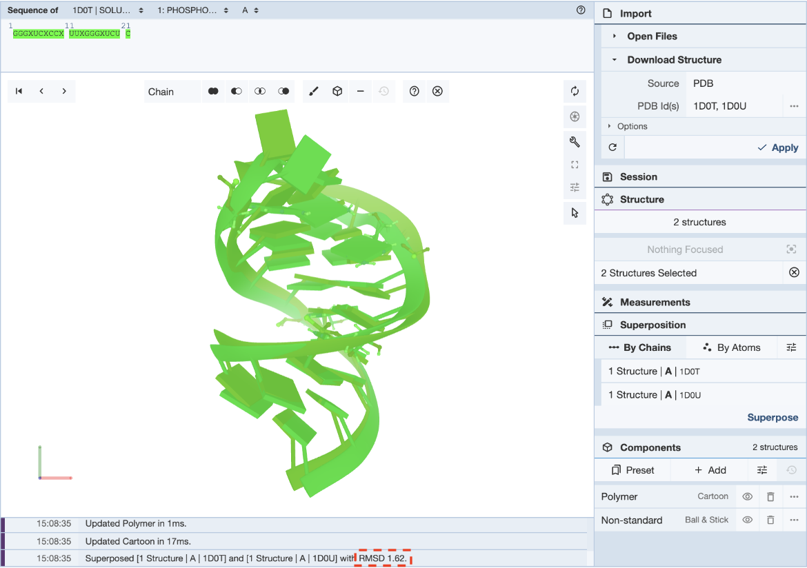 In this example, in a superposition of the structures 1D0T and 1D0U, the whole chain is selected for both structures to align them. This gives an RMSD value of 1.62.
