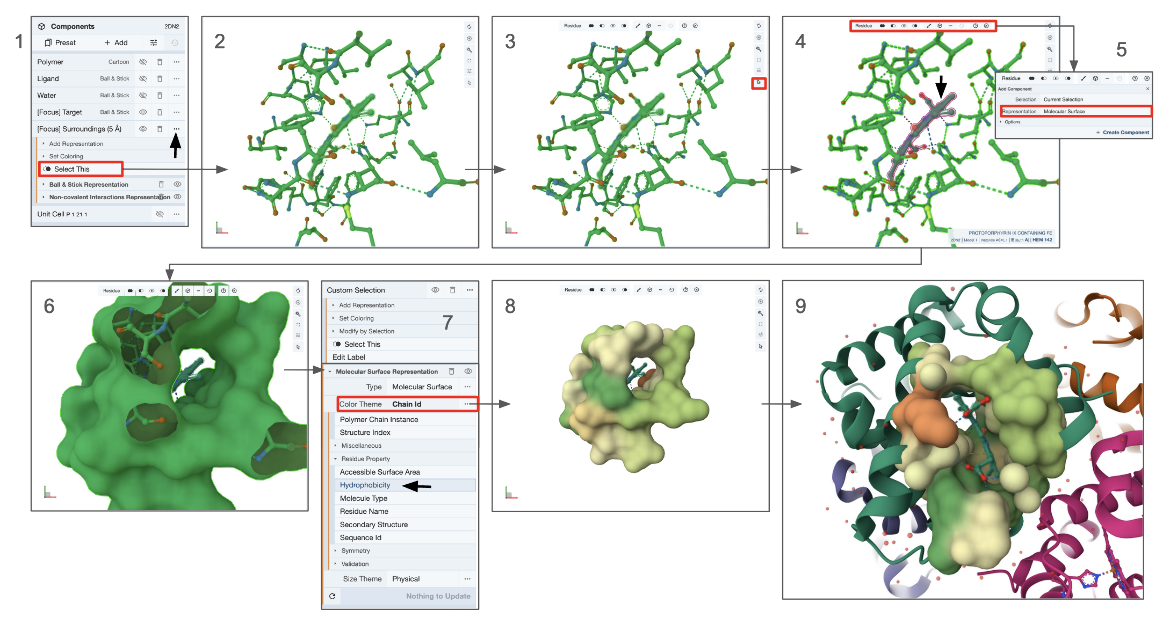 The binding pocket refers to the amino acid residues surrounding the location (pocket) in the protein where a specific ligand binds. Select the amino acid residues interacting with the ligand of interest. Now use the following steps (also shown as the numbered screenshots in the figure below):