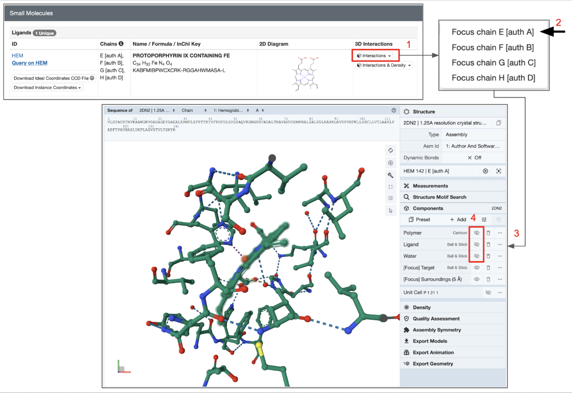 Click on the Interactions button in the Small Molecules section of the Structure Summary Page to focus on a specific ligand to explore. This will open the Mol* page showing the structure centered on the selected small molecule and displays it in a ball and stick representation. All residues within 5 Å of the selected ligand are also displayed along with covalent and non-covalent interactions between them. To see the ligand its neighborhood only, hide the Polymers, Ligands, and Waters by clicking on the eye icon next to these Components (see red outlined box with 4 written above it.)