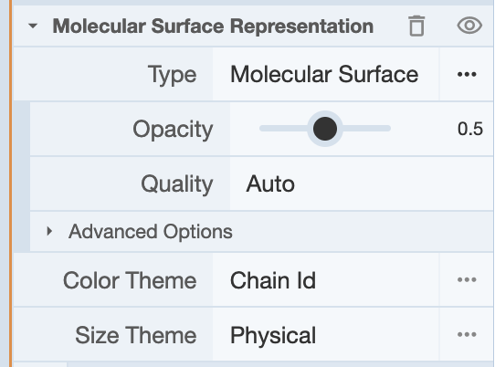 To change the transparency, select the whole structure or part of the structure using Selection Mode. To display a molecular surface click the Create Components options to select "Molecular Surface" in its Representation. Click on "Apply Theme" to display the molecular surface. Expand the Molecular Surface Representation created and click on the three dots next to it to display its Type Properties. Use the Opacity slider to adjust the transparency of the surface. The transparency can be similarly adjusted using the Opacity slider for any representation (e.g., Ball and stick)