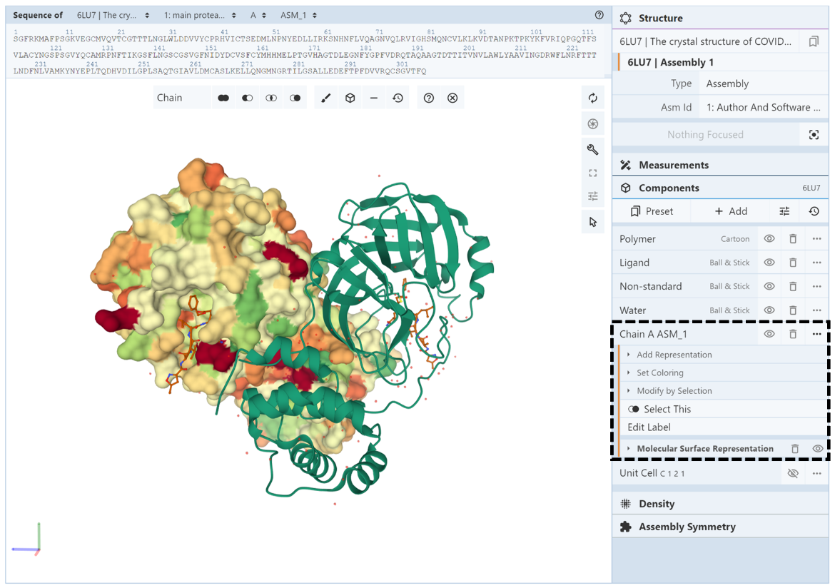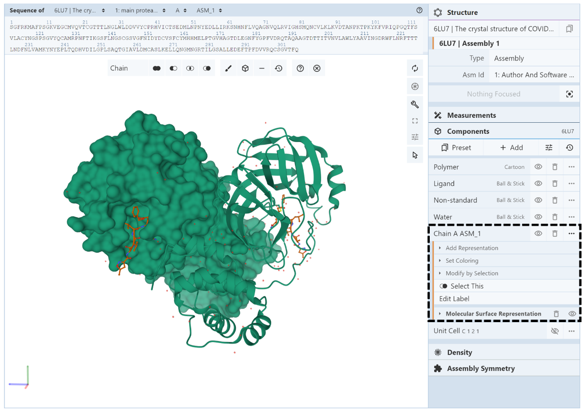 The easiest way to do this is to make a component of the chain you are trying to change. In the Components Panel, you can then select the component of the chain to change its color or representation. For example, PDB structure 6lu7 depicts the main protease of SARS-CoV-2 with an inhibitor N3. The biological assembly contains two identical chains (which we will call chain A ASM_1 and chain A ASM_2). When this structure is opened in Mol*, both chains are colored green and are shown in the ribbon representation. Suppose you wanted to show the molecular surface only chain A ASM_1and color it based on hydrophobicity. The first step is to select the entirety of chain A ASM_1 and create a component of it. To change the representation, open the components menu for the chain A ASM_1 component (shown in a black box with a dashed line in the image below ). Use the Add Representation menu and click on “molecular surface.” The display should look like the following: