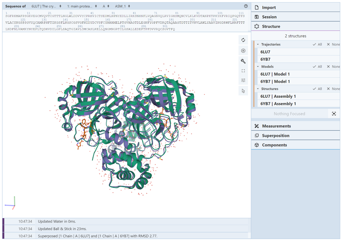 | Superpose two structures (PDB entries 6lu7 and 6yb7) in Mol* |