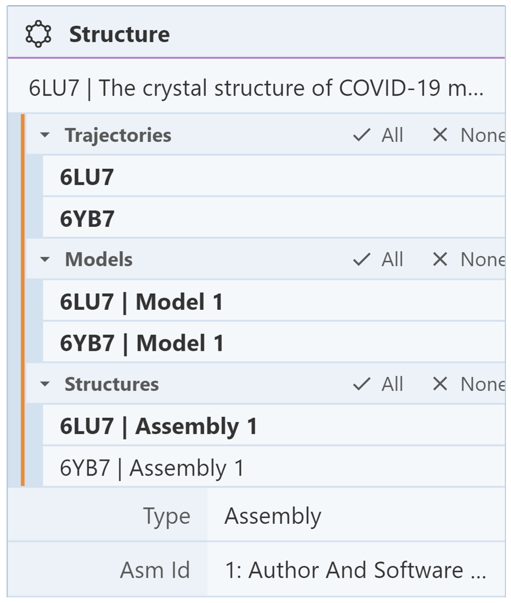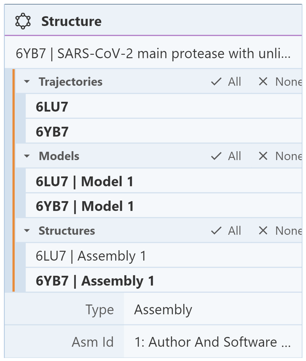 Next, we want to hide one of the structures while showing the other structure. Suppose the structure we want to hide is 6lu7. To do this, go into the Structure Panel and locate the Structures menu. This menu lists each structure uploaded into Mol*. Clicking on one of the structures in this menu will show the components for just that structure in the Components Panel. We want to see the components for only 6lu7 so we can opt to hide them. In the Structures menu, click on “None” to deselect both structures, then click on “6LU7 | Assembly 1” to display its components. The Structures menu should look like the following image: