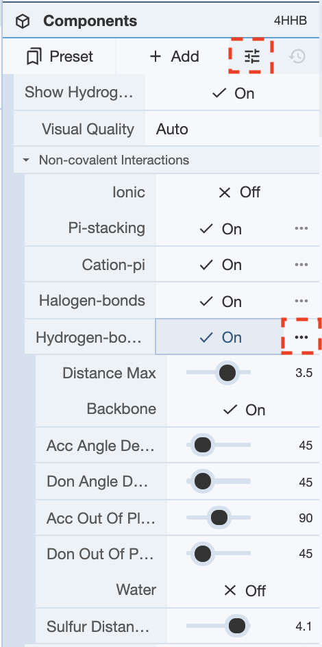 In order to change the parameters for hydrogen bonds, or any other non-covalent interactions, click on the Options button in the Components panel, and click on the options button for any of the interactions you want to tweak the parameters for. Once this is done, there are various options for tweaking the parameters. Clicking on the question mark for any of the options will give a short description of what that option is responsible for calculating.