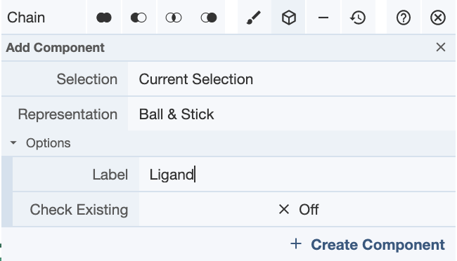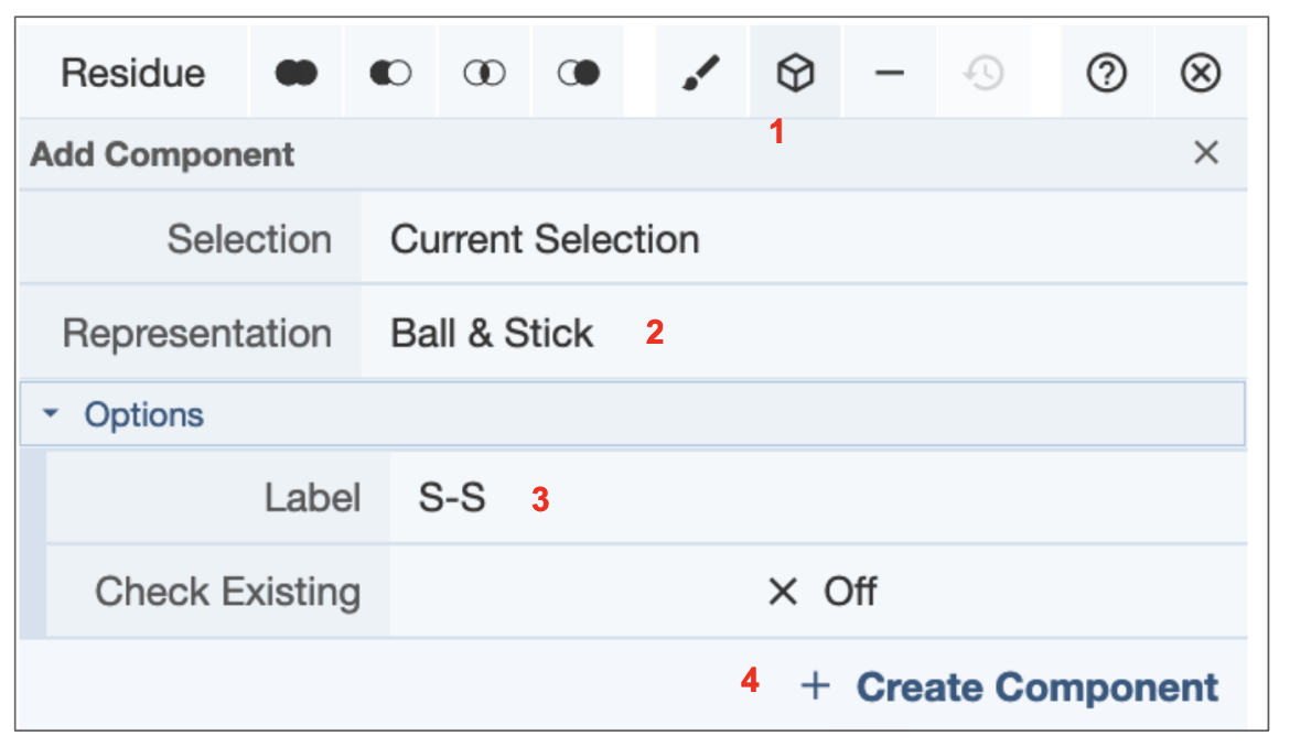 Go back to the Selection Mode toolbar and click on the create a component option. Select Ball and Stick for the Representation, assign the component a name (e.g., S-S), and click on the Create Component button at the bottom of the box.
