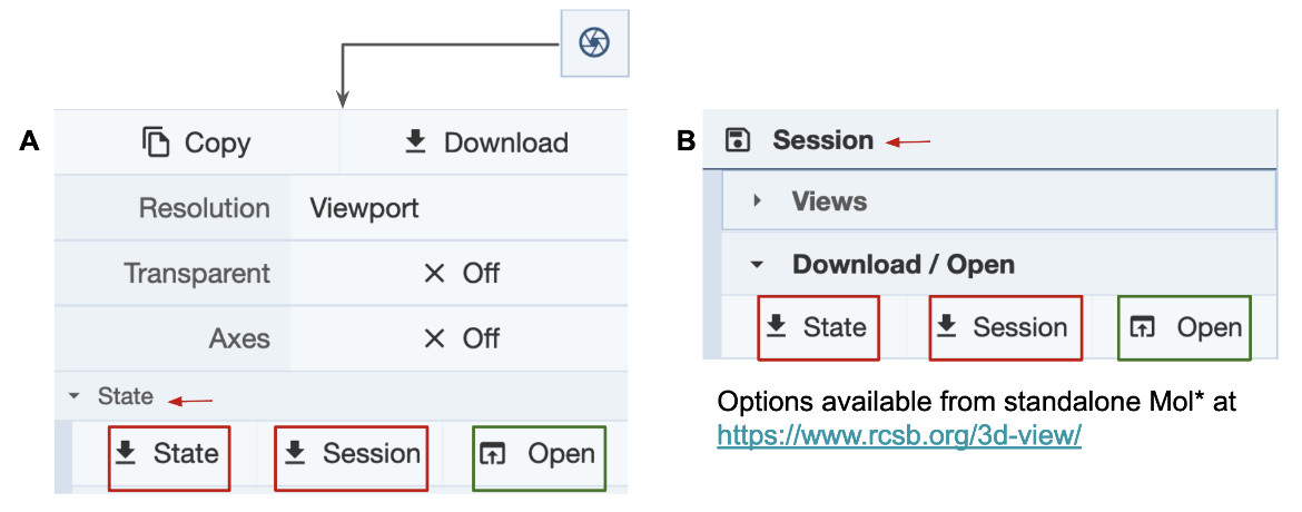 In the standalone version of Mol* the save State and Session options can also be accessed under the Session options in the right hand Control panel.