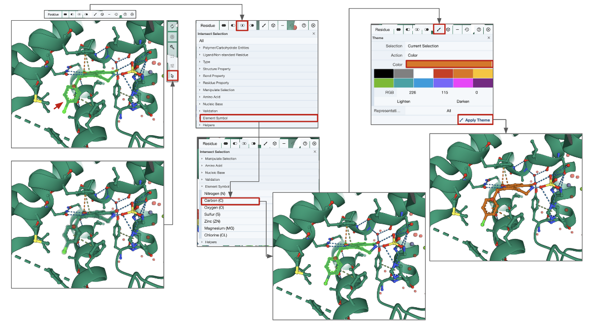 - Select the color you wish to paint the selected carbon atoms and click on Apply Theme. This should color the ligand or other selected atoms so that the carbon atoms are colored in the selected color, while the nitrogen and oxygen etc. are still colored by their CPK colors.