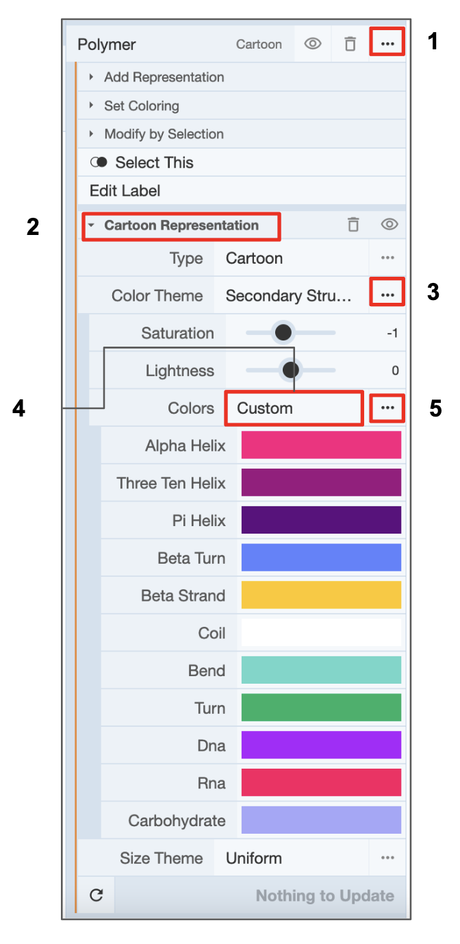 - Carbon atom matches the polymer chain coloring (default option used in Mol*): follow the steps listed below.