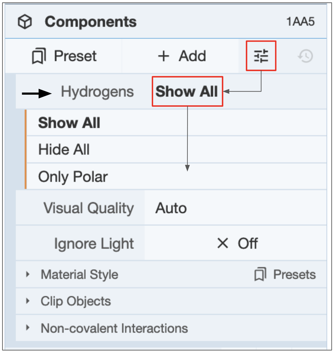 In order to show any non-covalent interactions, the components’ representations need to be adjusted by clicking on the options under the button next to Add in the Components Panel. Once the options button is clicked, a drop-down menu will show the various menus, including one with options for displaying and hiding hydrogens. Click on the Show All (default) options to select the other options e.g., "Hide All" and "Only Polar" hydrogens.