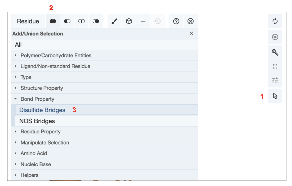 | 1. activate the selection mode 2. select the Add/Union option 3. select Disulfide Bridges from the Bond Properties options |