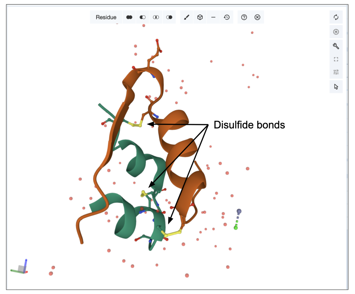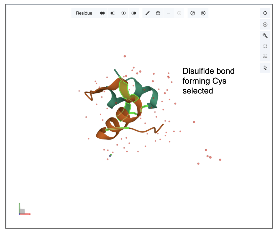On the 3D canvas you should now see the disulfide bond forming amino acids are selected and shown with a green halo. For example, in the case of PDB ID 1trz, you will see as follows: