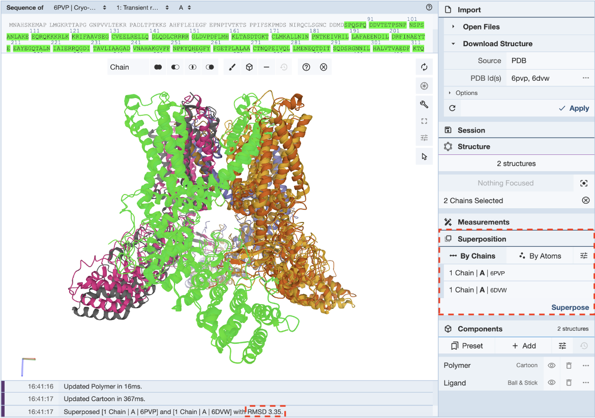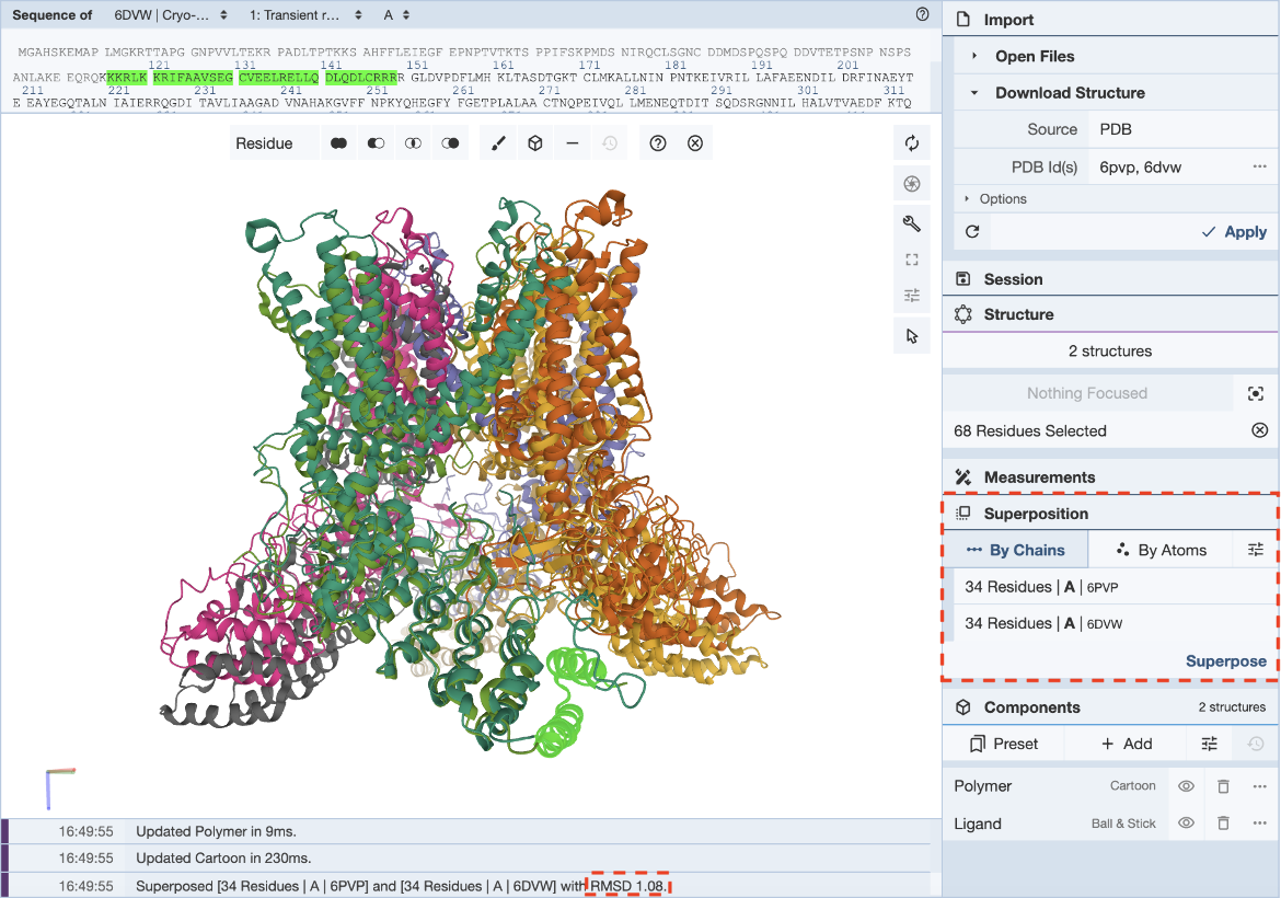 There are advantages to superposing “by chains” and “by atoms.” For instance, superposing by chains is useful when seeking to align dissimilar structures. If the regions that need to be aligned are unknown, superposing by chains helps orient secondary structural elements in the 3D canvas. Another benefit of superposing by chains is aligning selected residues. This enables parts of chains (e.g., domains, active sites) to be aligned in multiple structures. In this example, the PDB IDs 6PVP and 6DVW are used. These structures represent open and closed state transient receptor proteins. It is possible to align the proteins by chain, which yields an RMSD of 3.35. When 34 residues from only one of the helices is selected from the same chain in each structure, an RMSD of 1.08 is recorded. This is a good method to reduce the RMSD.