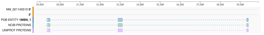 • To see the mapping between proteins and genes: Blocks display the position of PDB Entities (Blue), NCBI proteins (Green) and UniProt proteins (purple)