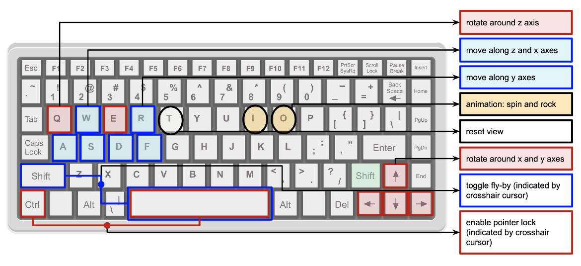 In addition to mouse controls there are select combinations of keys on the keyboard that may be used to control the displayed molecule in the 3D canvas. These controls are summarized below and marked on a keyboard in Figure 2.