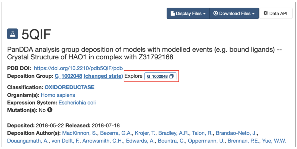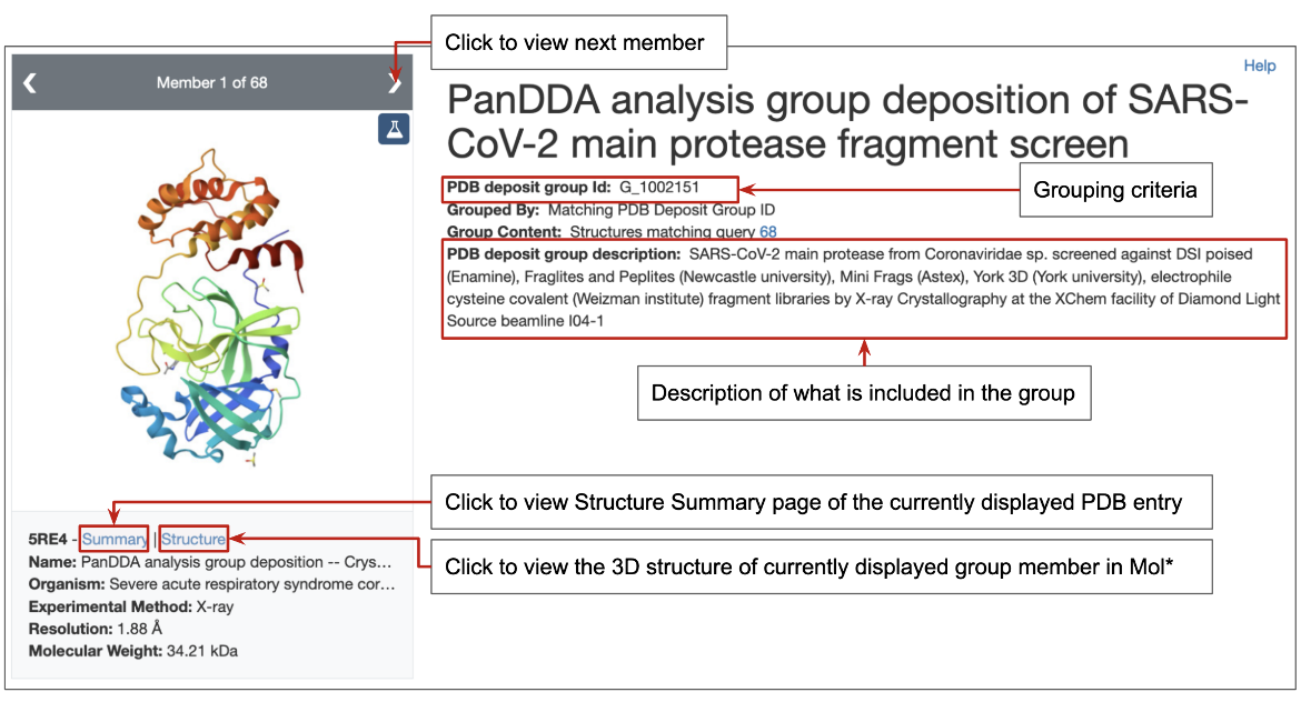 Figure 1: Click to view group of structures with a specific PDB Deposit Group ID, as marked in the header section of the Structure Summary page.