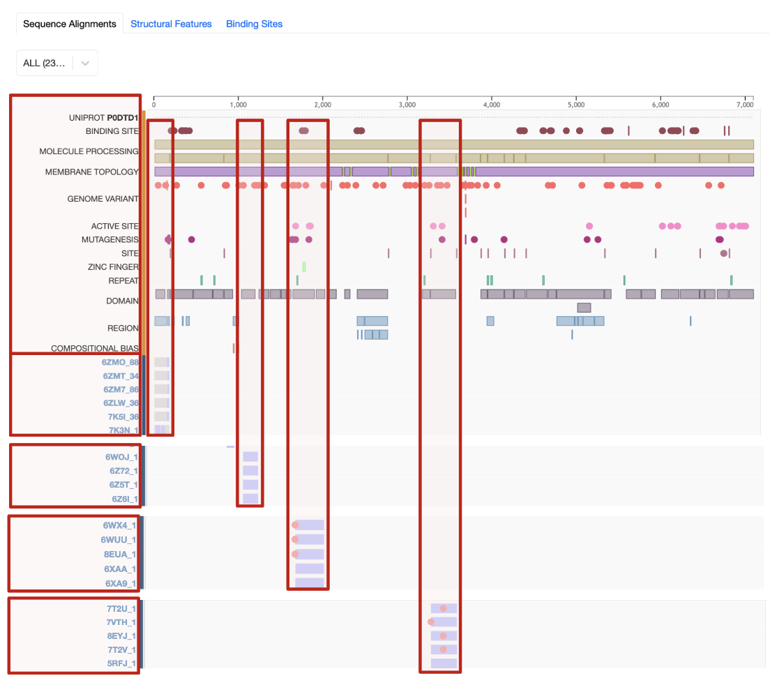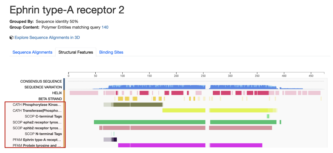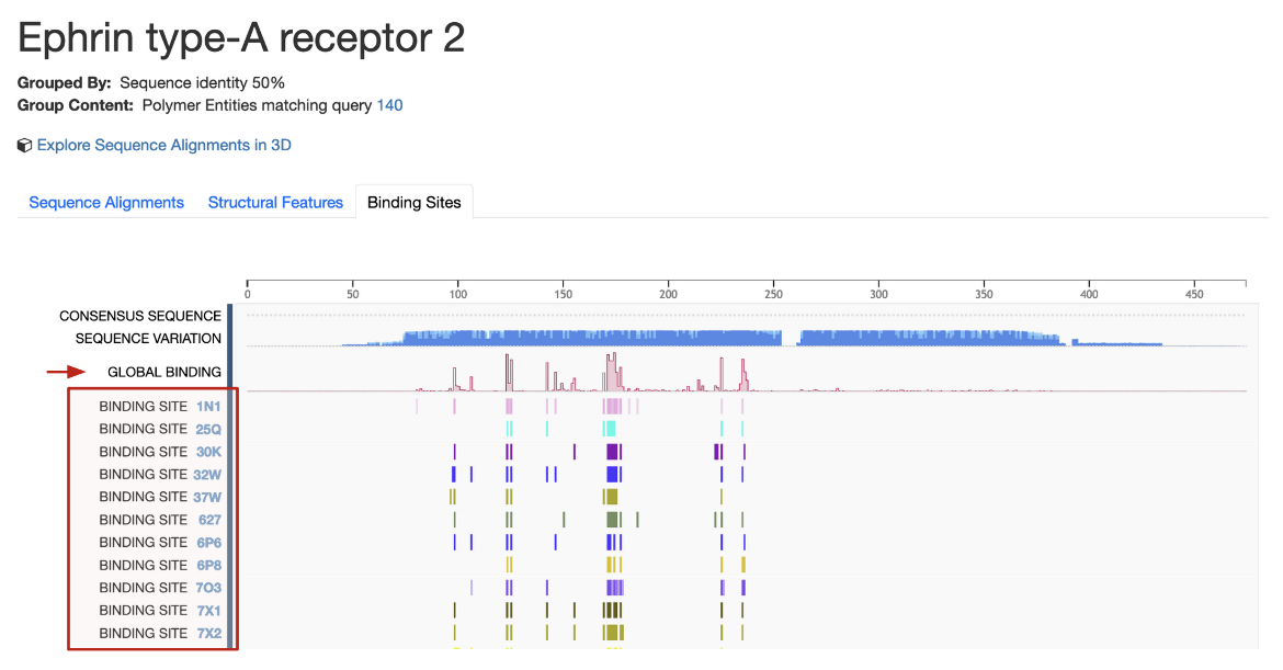 Following the summary, there are 3 tabs with multiple sequence alignment of all members of the group, mapping of structural features from various resources on the UniProt sequence, and a mapping of the binding sites on the UniProt sequence.