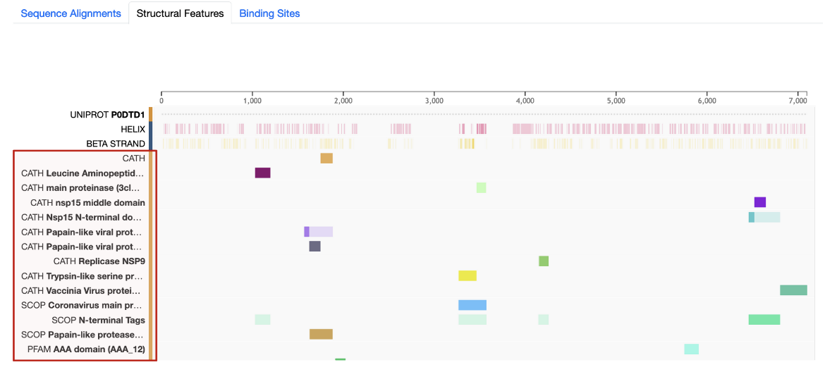 • PDB entity tracks, color-coded by the blue vertical bar, show structurally determined regions of PDB sequences and how these regions map to the UniProt sequence. Note that polymer entities present in different PDB structures map to different regions of the UniProt polyprotein sequence.