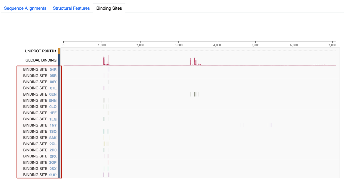 Figure 12: Individual and Global ligands binding sites mapped to the UniProt sequence.