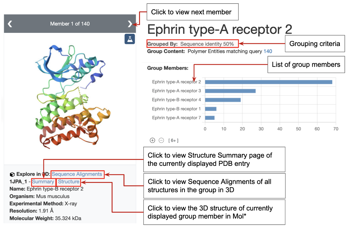 The Group Summary Pages (GSPs) provide overviews of key features, properties, sequence alignments, and annotations of any predetermined or custom group of structures. This is in contrast to the Structure Summary Pages (SSPs) that provide a quick overview of key details of a single structure in the PDB. Each group summary page also provides access to amino acid sequence information of all members of the group, ranges of amino acid sequences that are included in each member of the group, as well as structural and functional annotations of the sequence drawn from a variety of experimental and bioinformatics data resources.