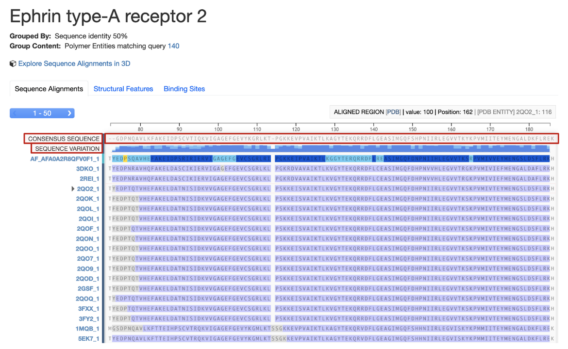 Figure 14: Multiple Sequence Alignment of polymer entities mapped to the consensus sequence of the sequence cluster. The top red boxes denotes the consensus sequence; the "Sequence Variation" row presents the conservation of amino acid sequence at any given position; and the rows of purple and gray text shows the amino acid sequences.
