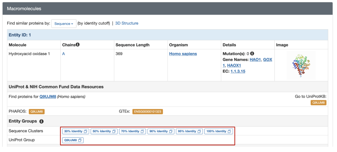 • Polymer entity Groups, which present summaries of the contents and properties of the structure, a few functional annotations mapped to these polymers, and a variety of views of multiple sequence alignments of polymer sequences in the groups.