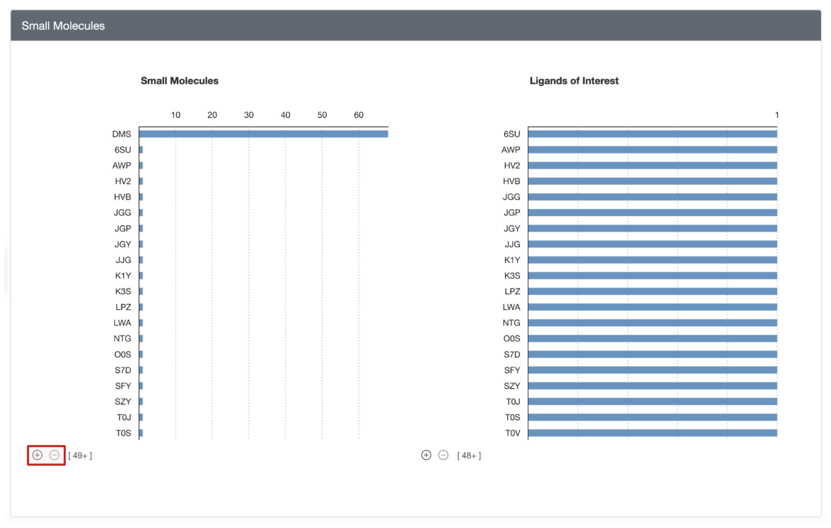 • Small molecules associated with members of the group are listed as two histograms (see Figure 4) - one showing all the small molecules in these structures (including solvent molecules, buffer components, crystallization agents etc.) and another showing only ligands of interest. Learn more about Ligands of Interest here.