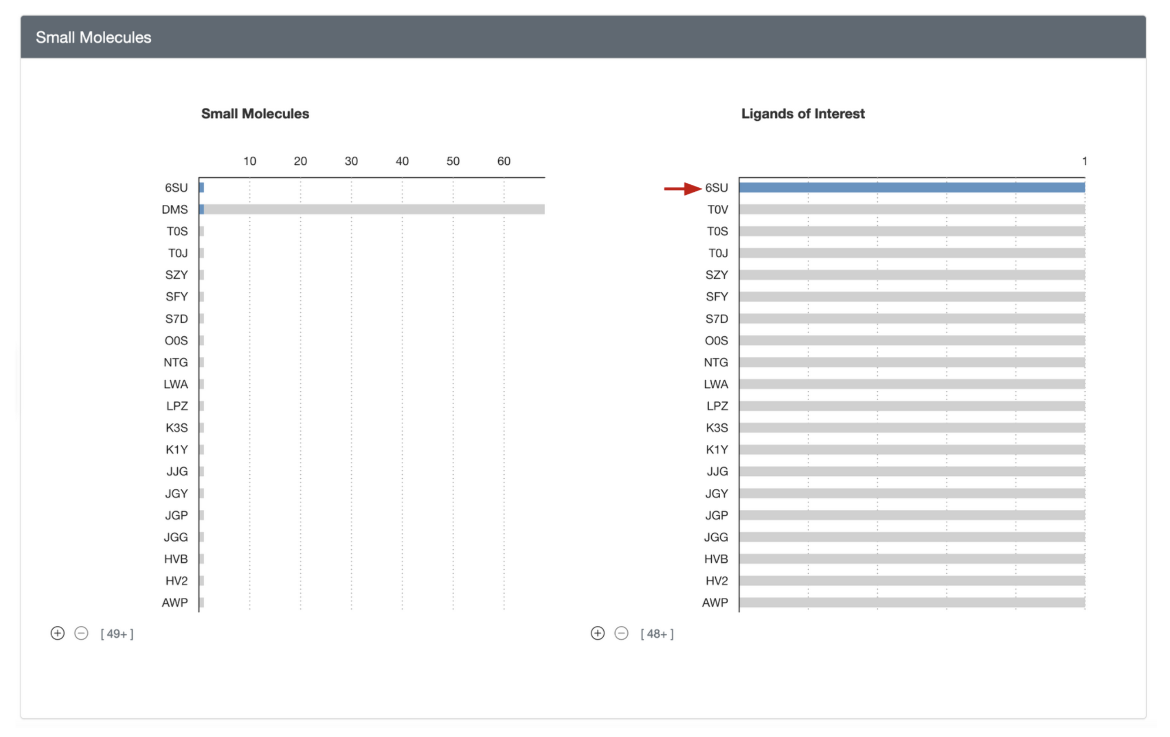 • For example, clicking on the ligand of interest with chemical component ID 6SU in the above small molecule histogram limits the group to include only (Figure 5).