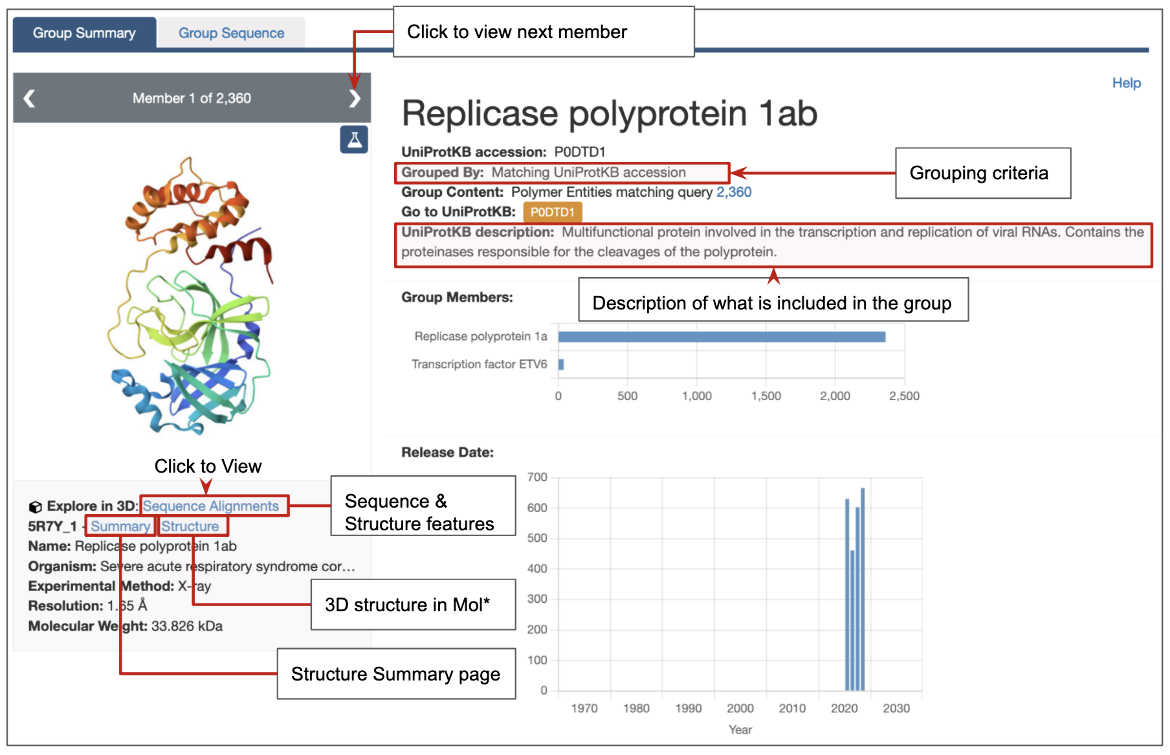 The contents and navigation of the UniProt Group Summary page is explained with an example - all polymer entities that map to UniProtKB accession P0DTD1 - the Replicase polyprotein 1ab.
