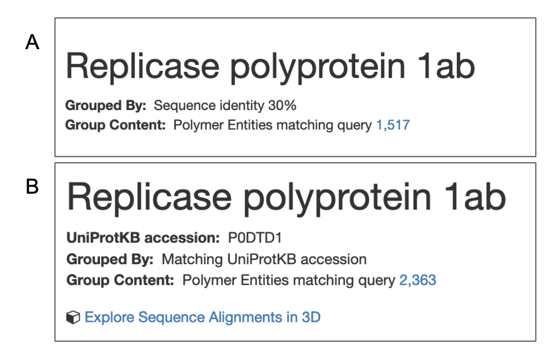 Figure 8: Summary of Grouping at the top of the Sequence Tab of the Group summary page for a case where the polymer entity grouping was done by A. sequence identity, and B. UniProt accession.