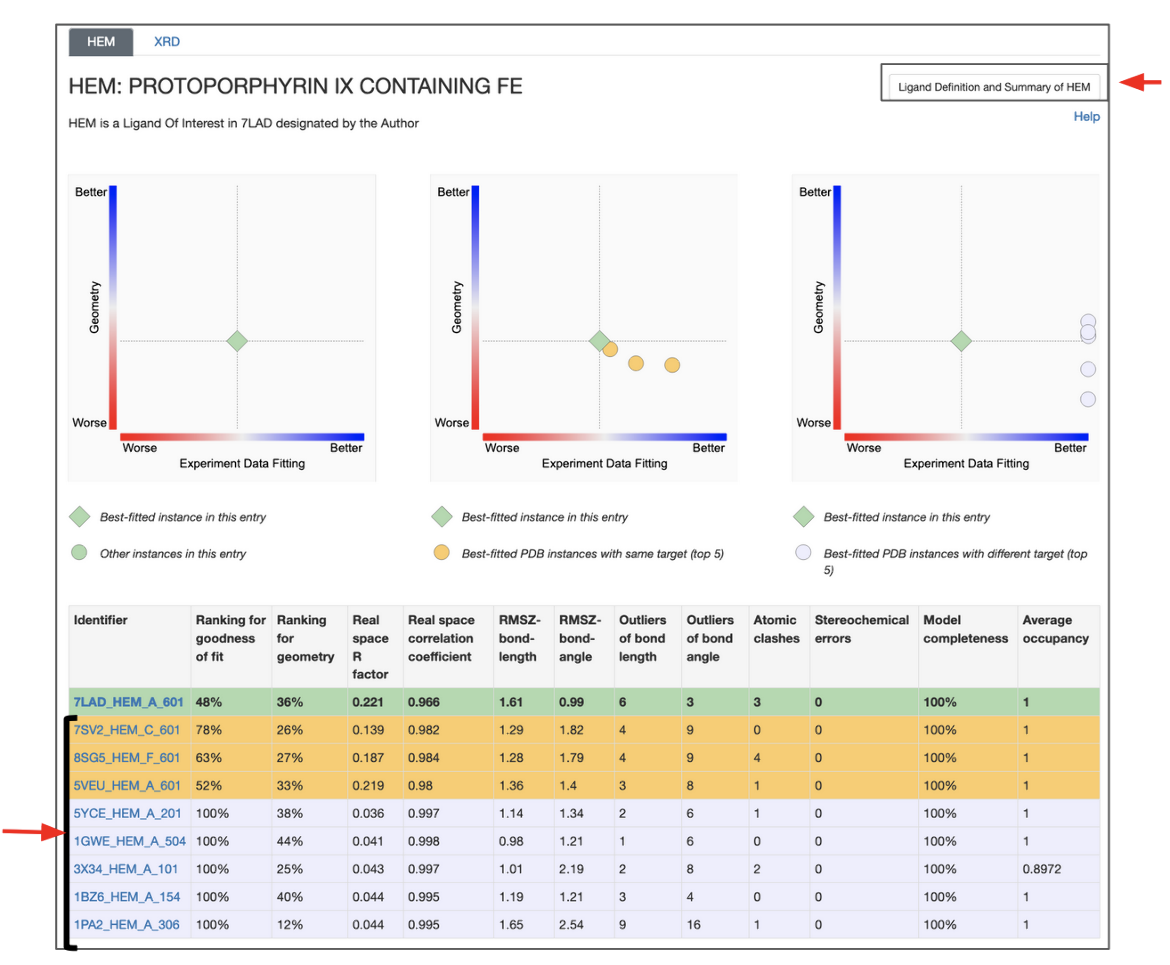 The experimental data fitting vs geometry 2D plot in the left presents ligand quality for all instances of the ligand in the structure. The best instance is shown as a green diamond, while all other instances are shown as green circles. All other data on the ligands tab compares the quality of the ligand in the entry of interest in other structures.