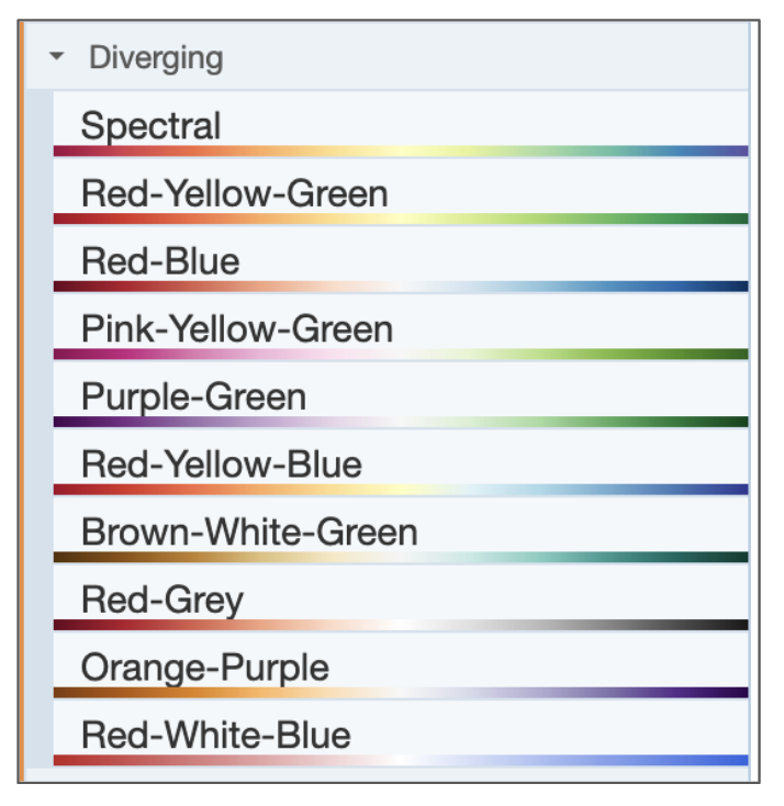 Types of diverging color scales available in Mol* are shown in Figure 8 and their frequent uses in data visualization are described below: