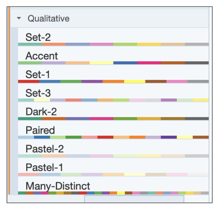 - Paired: A set of 6 pairs of colors (12 colors total) often used for distinguishing pairs of data points or categories. Each color pair is a lighter and darker version of a given color. The colors are blue, green, red, orange, purple, and brown.