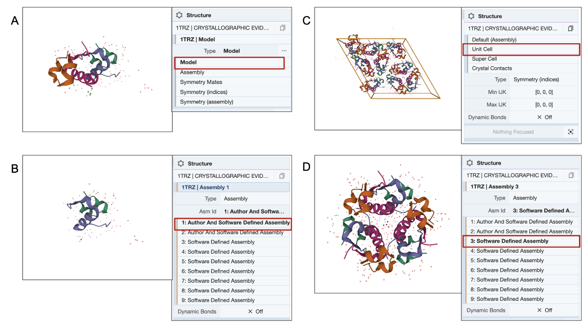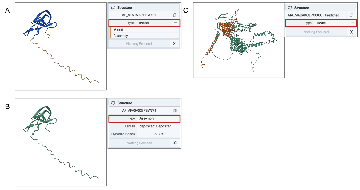 - For any structure of interest, the Mol* tool can be used to view the entire molecule (or model), specifically selected subsets of it, or supersets (assemblies) of the structure.