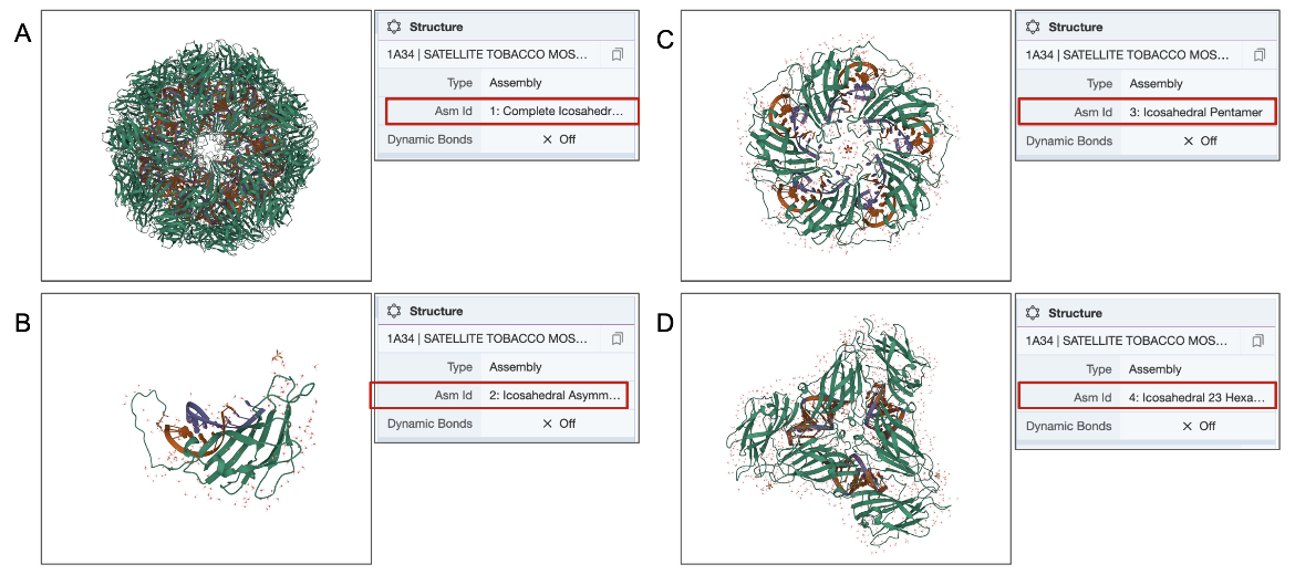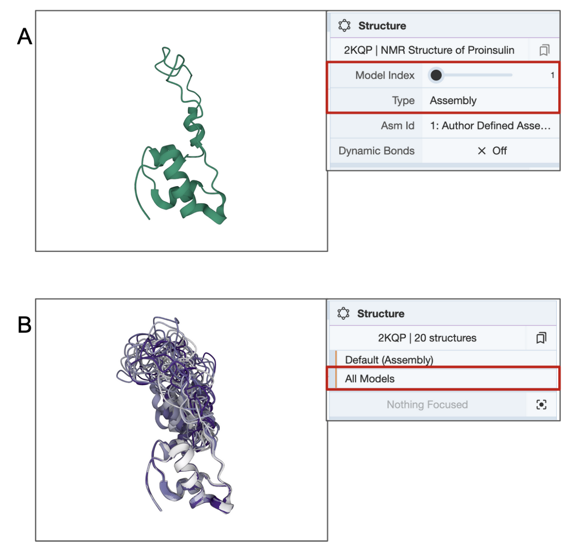 Examples: A few examples illustrate options in the Structure panel to customize the molecular display in the 3D canvas. Different assemblies of the X-ray structure of insulin are shown in Figure 1. Note that each polymer chain is colored in a different color. The representative model and ensemble of the NMR structure of proinsulin is shown in Figure 2. Various assemblies of proteins making up the X-ray structure of satellite tobacco mosaic virus, an icosahedral virus, are shown in Figure 3. The model and assembly coordinates are identical for CSMs - in the default view, CSMs with a single polymer chain are colored by residue-level pLDDT scores in the 3D canvas. The same structure in the assembly view and CSMs with more than one polymer are displayed with different colors for each polymer chain (Figure 4).