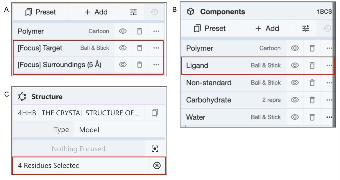 | Figure 6: Different ways of focusing on A. a specific residue; B. existing component; C. selected residues. |